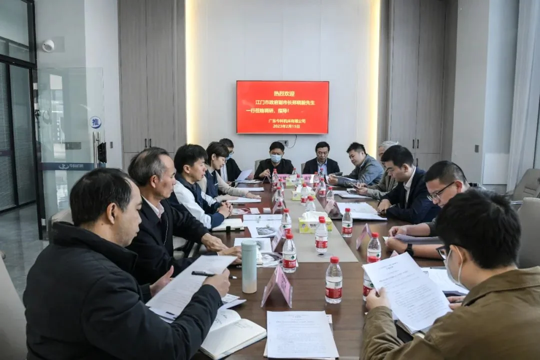 邝锦富先生代表公司,对郑晓毅副市长一行莅临公司调研指导,表示热烈的欢迎!对关心、支持、帮助公司发展的各级领导与朋友,表示衷心的感谢!并汇报了公司目前的生产经营情况、发展目标与规划,遇到的主要困难,并提出了一些希望。蓬江区委、市金融局、市政府投资促进中心、市金融投资公司及棠下镇相关领导即时回应,提出了解决问题的办法或建议,郑晓毅先生指示相关部门要做好跟进、对接和服务工作。郑晓毅先生最后作了总结讲话,一是希望今科机床公司继续努力拼搏,加大研发力度,以“三年工作两年完成”的决心,提高产能,促进企业高质量快速发展;二是相关部门要全力做好跟进工作,为企业提供贴心服务,帮助企业做强、做大。